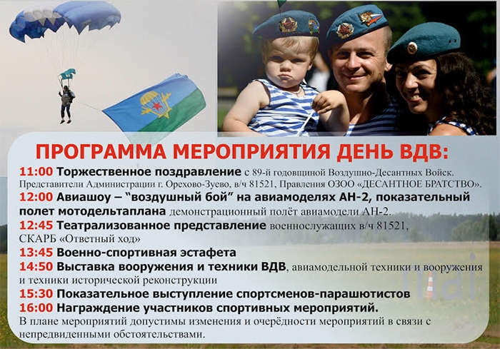 Приглашаем Вас принять участие масштабное городское мероприятие в г. Орехово-Зуево посвященное 89 годовщине ВДВ.